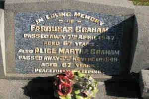 21. Farquahr "Frank" Graham was born in 1880, died on 7 Apr 1947 in Moonee Ponds at age 67, and was buried in Lake Bolac Cemetery. Another name for Farquahr was Pompi.